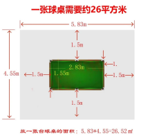 台球桌摆放需要多少平方? 摆放一个台球桌需要约26平米 标准中式台球桌尺寸为1.55米 x2.83米 标准球杆长度为1.45米 四周至少要留1.5米以上的出杆空间 所以空间需要4.5米宽 5.8米长以上 面积大约是26平方米 多张台球桌可以共用中间的1.5米具体需要面积可以根据上面示意图测算