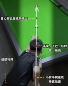 二、身体姿势:稳定的支撑 站位:确定母球的出球线后,右脚踩在这条线上(右撇子为例),左脚自然向右脚左前方30度方向迈出一个肩膀宽度的距离 。同时,右脚距离母球的距离大概比整个球杆长度小三十到四十公分,以自身舒适为核心进行调整 。正确的站位能让我们在击球时保持平衡,为后手发力提供稳定基础。 俯身姿势:身体自然趴低,将下巴贴在球杆上,这样可以更好地瞄准目标球。在运杆和出杆过程中,除了小臂,身体其他部位都要保持稳定,尤其是头部不能晃动。稳定的身体姿势有助于减少后手的晃动,提高击球准度。比如,在职业比赛中,选手们的身体姿势都非常标准,这使得他们能够更稳定地控制后手,实现精准击球。