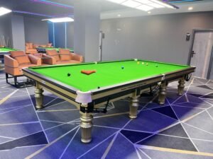 • • 台球桌:不同类型的台球有不同的尺寸,通常有6个袋口。施派克台球桌采用九江A级青石板搭配进口高弹胶边,坚固耐用,是开球房的首选球桌。